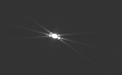 bright star surrounded by spikes in a X pattern and line running through it. As